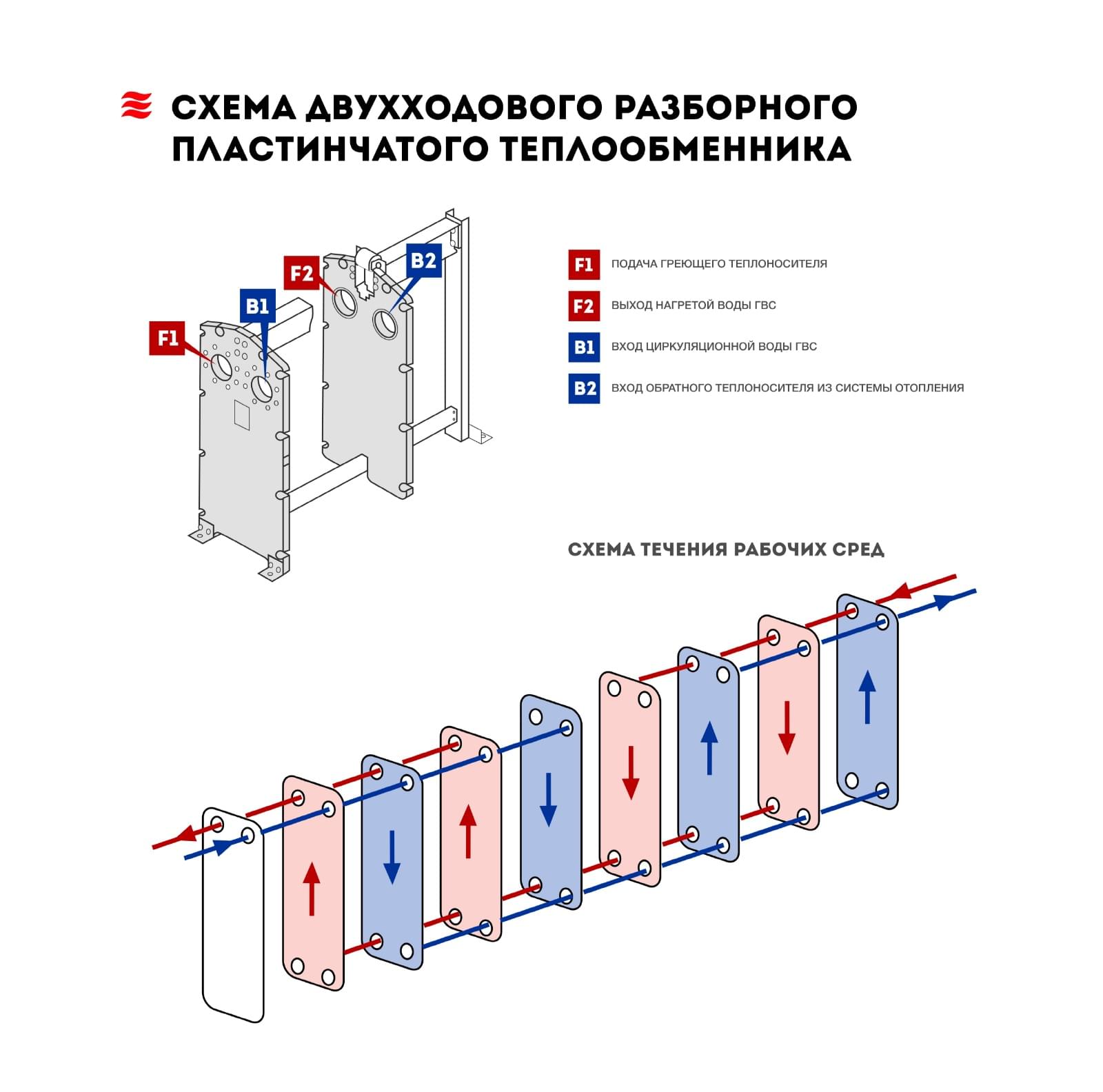 Теплообменники подходят для воды, пара, гликолей, масел, пищевых жидкостей, кислот и щёлочей (в зависимости от материала пластин/корпуса).